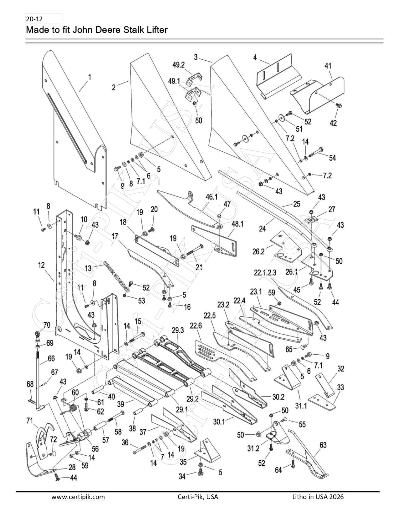 63 – #GB75594 Description: STALK LIFTER EXTENSION – LOW PLANT EXTENDED REACH OEM Part: GB75594 Section: Picking Unit Cabinet Made to fit John Deere Stalk Lifter 63 - #GB75594 quantity Add to cart SKU: S.L.SH.EXTD.RCH Categories: GB75594, John Deere Picking Unit Cabinet, John Deere Stalk Lifter, Picking Unit Cabinet, Picking Unit Cabinet-110 Tag: 14P1.pdf Assembly Drawing Description Download PDF More Made to fit John Deere Stalk Lifter Parts for this Assembly 1.1 - #17307 1.2 - #17309 10 - #88188P 11 - #76152P 12.1 - #46327 12.2 - #46326 13 - #20137 14 - #01305P 15.1 - #01912P 15.2 - #07811P 16 - #01540P 17 - #97971 18 - #98064 19 - #10215P 2 - #17311 20 - #01519P 21 - #01837P 22.1 - #73162 22.2 - #76060 22.3 - #76060-XL 22.4 - #73719 22.5 - #79098 22.6 - #79098-XL 22.7 - #79099 23.1 - #21618 23.1 - #72931 23.1 - #79097 23.2 - #21619 23.2 - #72930 23.2 - #79096 24.1 - #92710 24.2 - #92711 25.1 - #92708 25.2 - #92709 26.1 - #78882 26.2 - #39149 27 - #17561 28.1 - #91622 28.2 - #02062 28.2 - #77420 29.1 - #75226 29.2 - #76014 29.3 - #51194 3.1 - #17308 3.2 - #69288 3.3 - #69287 30.1 - #99886 30.2 - #93615 30.3 - #93616 31.1 - #74920 31.2 - #75594 32 - #72851 33 - #72852 34 - #10212P 35 - #97064 36 - #02128P 37 - #96204 38.1 - #48105 38.2 - #44705 39 - #93395 4 - #73573 40 - #99289 41 - #75407 42 - #07784P 43 - #63526P 44 - #07192P 45 - #75625P 46.1 - #74993 46.2 - #74994 47 - #15254 48.1 - #73028 48.2 - #73029 49.1 - #73580 49.2 - #69289 5 - #10213P 50 - #63525P 51 - #01730P 52 - #08063P 53 - #07426P 54 - #07810P 55 - #07186P 56 - #74600 57 - #71364 58 - #07225P 59 - #82222P 6 - #01292P 60 - #71360 61 - #74820 62 - #07835P 64 - #08064P 65 - #07191P 66 - #71597-K 67 - #00284P 68 - #07015P 69 - #07274P 7.1 - #81931 7.2 - #71361 70 - #21796 72 - #07190 8 - #47298P 9 - #12200P KIT - #72534