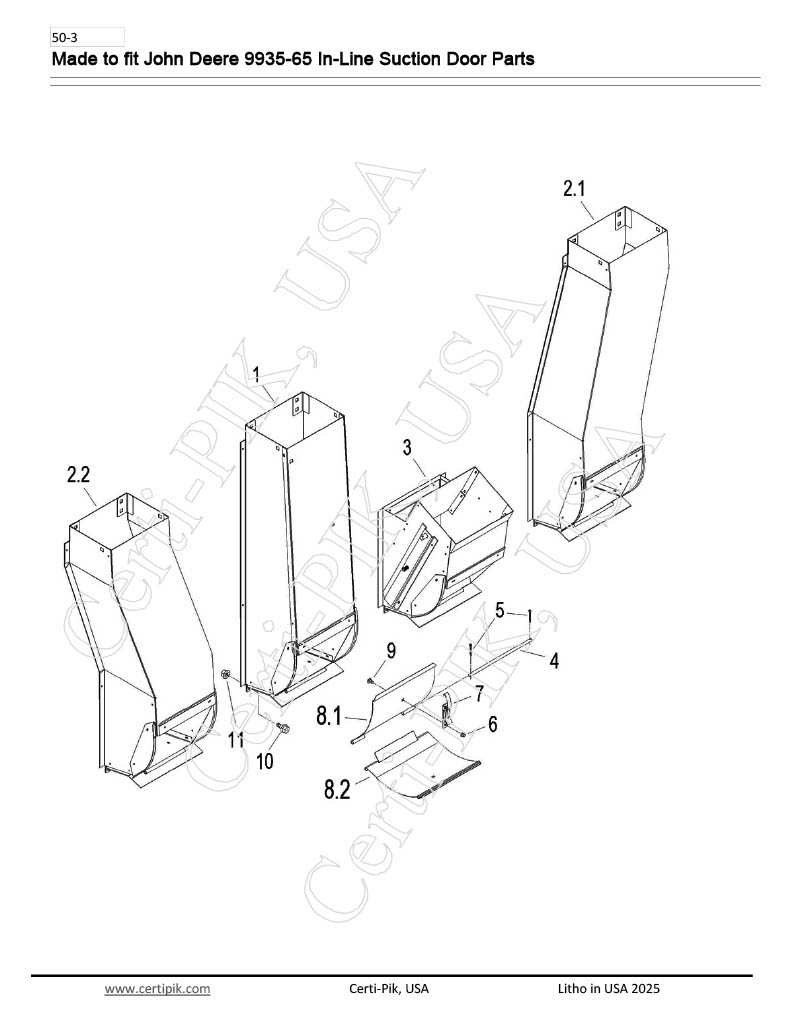 1 – #72383 Description: SUCTION DOOR – STRAIGHT (TALL) DOOR ASSEMBLY – 9960-9965 IN-LINE, (INCLUDES ITEMS #4 THRU #9) OEM Part: AN272383 Section: Air System Made to fit John Deere 9935-65 In-Line Suction Door Parts 1 - #72383 quantity Add to cart SKU: e1dfb6d83378 Categories: 72383, Air System, Air System-241, John Deere 9935-65 In-Line Suction Door Parts, John Deere 9935-65 In-Line Suction Door Parts-John Deere, John Deere Air System Tag: 29P1.pdf Assembly Drawing Description Download PDF More Made to fit John Deere 9935-65 In-Line Suction Door Parts Parts for this Assembly 10 - #14822P 11 - #10215P 2.1 - #95147 2.2 - #95147-X 3 - #93420 4 - #97195 5 - #00206P 6 - #10217P 7 - #94090 8.1 - #99131 8.2 - #AP99131 9 - #01893P