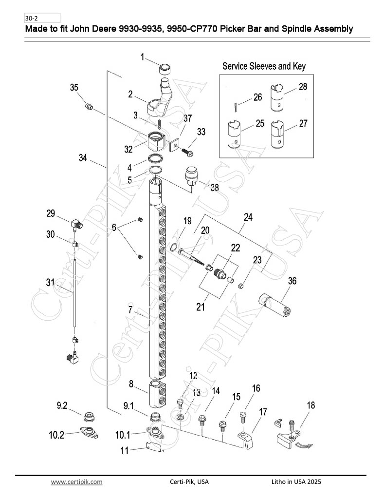 7.1 – #93320RPRM Description: BAR – 9960-65, 18 SPINDLE R.H. WITH PRESSED ON SLEEVE OEM Part: AN193320 Section: Picking Unit System Made to fit John Deere 9930-9935, 9950-CP770 Picker Bar and Spindle Assembly 7.1 - #93320RPRM quantity Add to cart SKU: 18S P-BAR 9960 Categories: 93320RPRM, 9950-CP690 Picker Bar and Spindle Assembly, 9950-CP690 Picker Bar and Spindle Assembly-John Deere, John Deere 9930-9935, John Deere Picking Unit System, Picking Unit System, Picking Unit System-130 Tag: 16P1.pdf Assembly Drawing Description Download PDF More Made to fit John Deere 9930-9935, 9950-CP770 Picker Bar and Spindle Assembly Parts for this Assembly 1 - #93500PRM 10.1 - #12291P 10.2 - #78364P 11.1 - #93694P 11.2 - #90952P 11.3 - #90953P 12 - #01813P 13 - #07065P 14 - #03695P 15 - #07865P 16 - #01900P 17 - #CPE683 18.1 - #CPE684CCW 18.2 - #CPE685CW 18.3 - #CPE687CCW 19.1 - #02889P 19.2 - #10223P 2.1 - #98724R 2.2 - #98725L 20 - #28390RP 21.1 - #13307P 21.2 - #12394P 22 - #11948R 23 - #79986 24 - #18840 25 - #76373 26 - #95970 27 - #95657K 28 - #76373K 29 - #15724P 3 - #64373 30.1 - #17044P 30.2 - #17044FP 31.1 - #74964-01 31.2 - #74964-02 32 - #70976 33 - #07835P 34.1 - #76734-K 34.2 - #74502-K 34.3 - #61220-K 35 - #79871 36.1 - #75063-1/2 36.2 - #75063-3/8 37 - #74229 38 - #CPIKT54 4 - #19589P 5.1 - #19581P 5.2 - #19854P 6 - #00558P 7.2 - #74501RPRM 8.1 - #73434RPRM 8.2 - #92810RPRM 8.3 - #92809LPRM 9.1 - #74832P 9.2 - #14503
